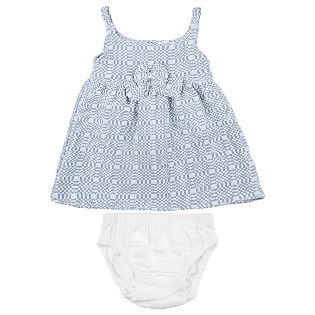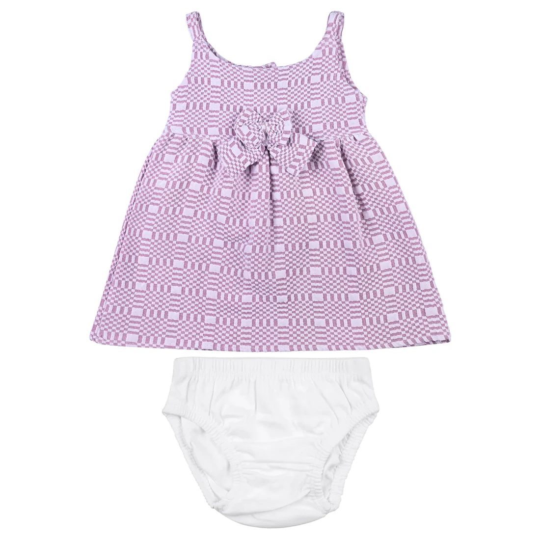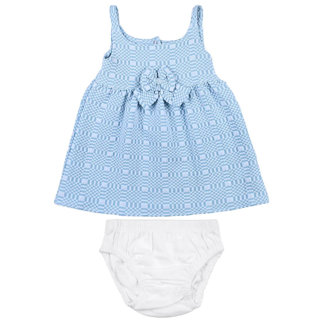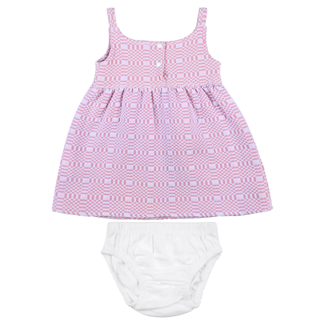 Dress your little one in ultimate comfort and cuteness with our Zuri Baby Dress Set. Made from soft 100% cotton interlock fabric, this outfit is designed especially for sensitive baby skin, ensuring breathability and all-day comfort. The set includes a sleeveless frock with delicate button details and matching diaper cover, making it both stylish and practical for everyday wear.